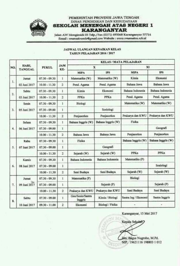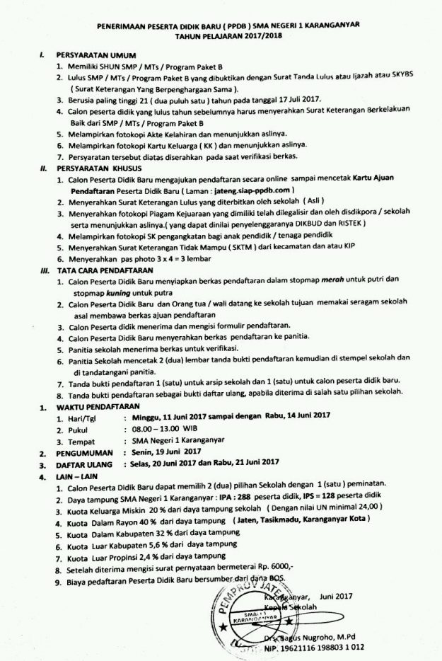 Pendaftar PPDB 2017, setelah pengumuman penerimaan PPDB pada tanggal 19 Juni 2017 dinyatakan diterima di SMAN 1 Karanganyar supaya untuk mengambil Formulir Daftar Ulang pada hari tersebut.