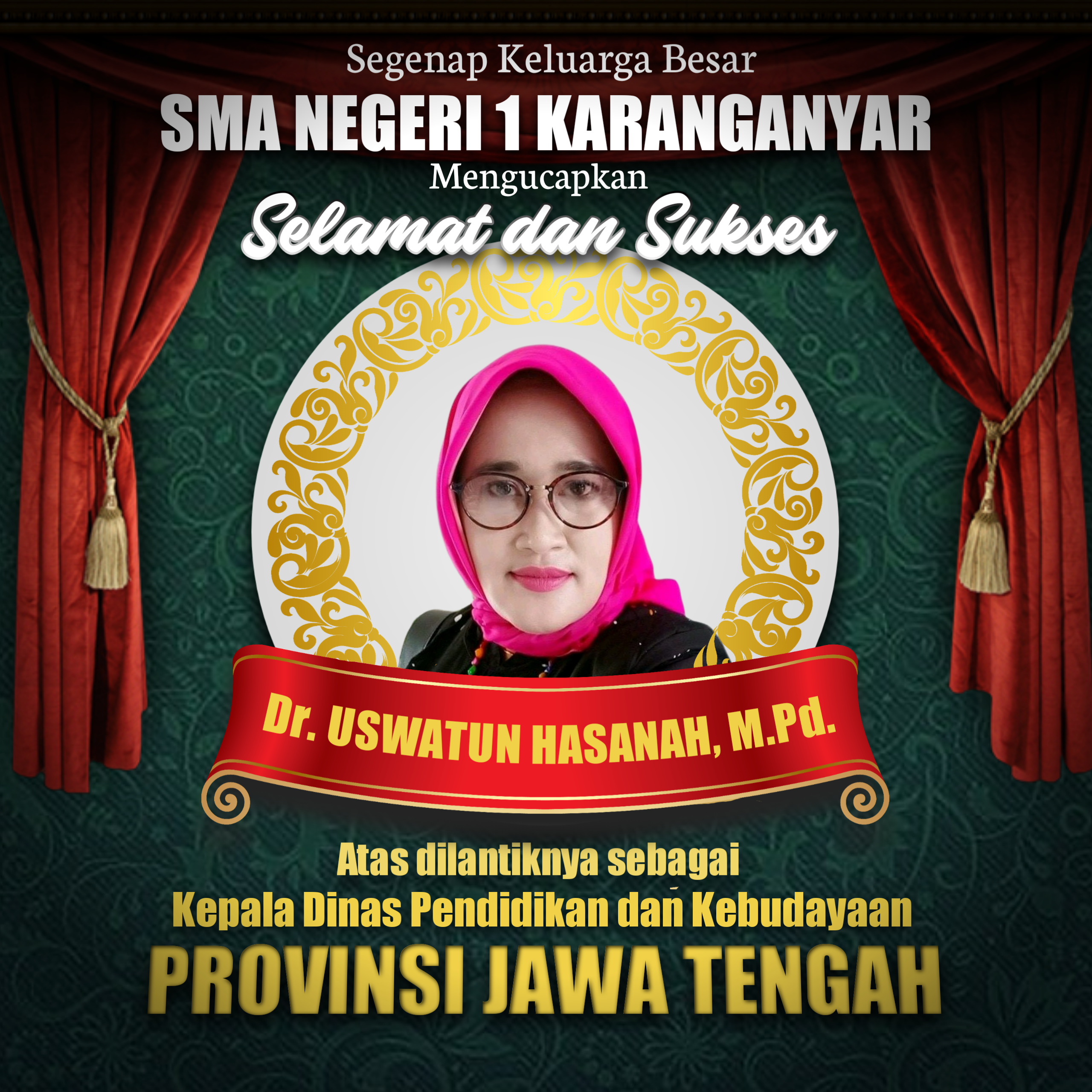 Segenap Keluarga Besar SMA Negeri 1 Karanganyar Mengucapkan Selamat dan Sukses Dr. Uswatun Hasanah, M. Pd Atas dilantiknya sebagai Kepala Dinas Pendidikan dan Kebudayaan Provinsi Jawa Tengah