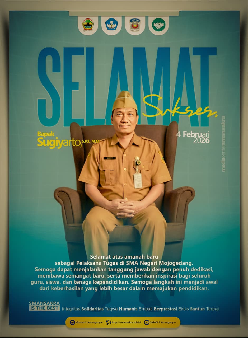 Kepala SMA Negeri 1 Karanganyar, Sugiyarto, S.Pd, M.M, mendapat amanah baru sebagai Pelaksana Tugas Kepala SMA Negeri 1 Mojogedang Kabupaten Karanganyar. Serah terima jabatan dilakukan di Kantor Cabang Dinas Pendidikan Wilayah VI, hari Senin, 2 Februari 2026.