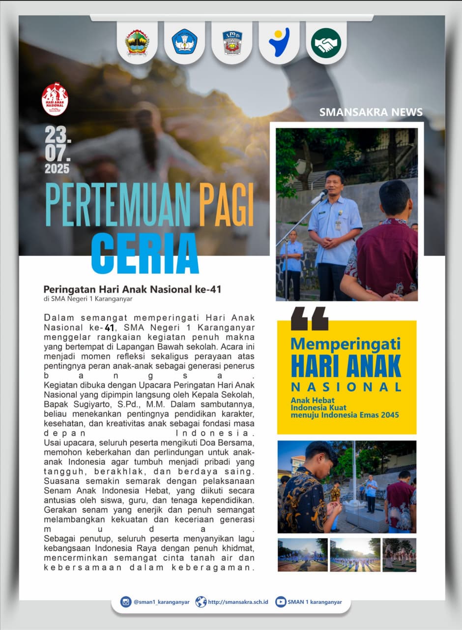 SMANSAKRA – Kegiatan Pembiasaan Hidup Sehat di lingkungan sekolah, dilakukan secara rutin di SMA Negeri 1 Karanganyar. Jumat, 3 Oktober 2025, guru, staf karyawan, dan siswa-siswi SMA Negeri 1 Karanganyar mengikuti kegiatan Jalan Sehat sebagai sarana membiasakan hidup sehat. Kegiatan ini dimulai pukul 7 pagi dan diawali dengan sambutan oleh Kepala SMA Negeri 1 Karanganyar,…