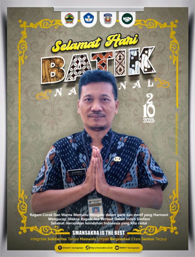 Dinten Batik Nasional dipunpengeti saben tanggal 2 Oktober. Kangge mengeti dinten batik, Kemis 2 Oktober 2025, dwija, karyawan saha siswa-siswa SMA Negeri 1 Karanganyar ngangge busana batik. Dinten Batik Nasional dipunkepyakaken ing 2 Oktober 2009. Tanggal menika dipunpiji, amargi ing 2 Oktober 2009, UNESCO kanthi resmi netepaken batik Indonesia minangka Warisan Kemanusiaan untuk Budaya Lisan…