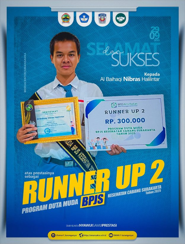SMANSAKRA – Al Baihaqi Nibras Halilintar, siswa kelas XI SMA Negeri 1 Karanganyar, berhasil menjadi Runner Up di ajang Program Duta Muda BPJS Kesehatan Cabang Surakarta Tahun 2025. Kegiatan tersebut diselenggarakan oleh BPJS Kesehatan yang bertujuan untuk meningkatkan literasi kesehatan dan mendorong keterlibatan generasi muda dalam mendukung keberlangsungan Program Jaminan Kesehatan Nasional (JKN). Program Duta…
