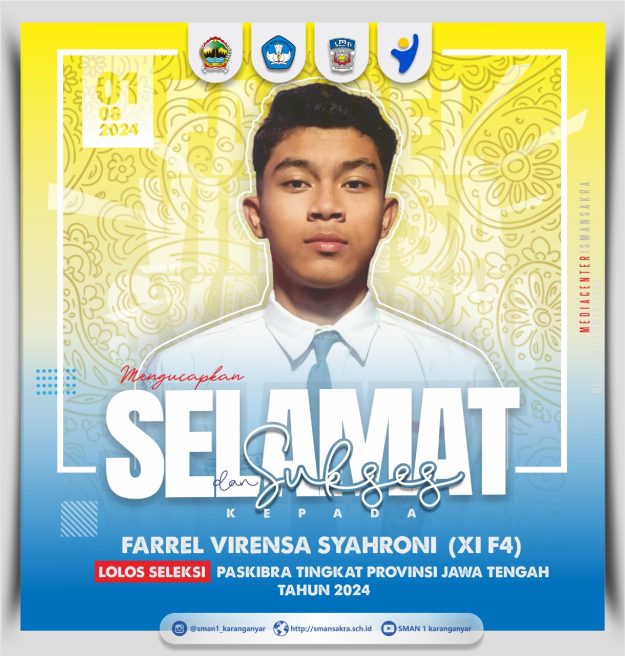 SMANSAKRA – Prestasi membanggakan kembali diukir oleh siswa SMA Negeri 1 Karanganyar. Farrel Virensa Syahroni salah satu siswa kelas XI F4 berhasil lolos dari seleksi Pasukan Pengibar Bendera (PASKIBRA) tingkat Provinsi Jawa Tengah Tahun 2024. Proses yang panjang dari seleksi ditingkat sekolah, Kabupaten, hingga sekarang melaju ke tingkat Provinsi. Farrel akan memulai mengikuti kegiatan Pendidikan…